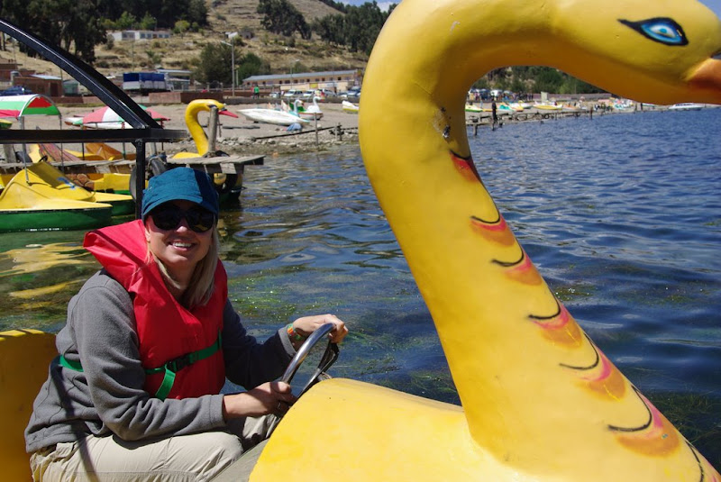 W Copacabanie za wiele do roboty nie ma. Woda jest zimna, wiec kapiel nie wchodzila w gre, chociaz jakims mlodziakom oczywiscie to nie przeszkadzalo. Ahh mlodym byc. Twarz bedzie sina, zeby beda szczekac, a dzieciak i tak bedzie mowil, ze woda jest ciepla:) Zauwazylismy jednak, ze jest jeszcze jedna mozliwosc znalezienia sie na powierzchni wody - rower wodny. Korzystajac z przykladu miejscowych osobnikow, lub innych przyjezdnych Boliwijczykow, wynajelismy sobie ubota o wdziecznym ksztalcie labedzia i popedalowalismy sobie po wodach portu podziwiajac widok na miasteczko od strony wody.