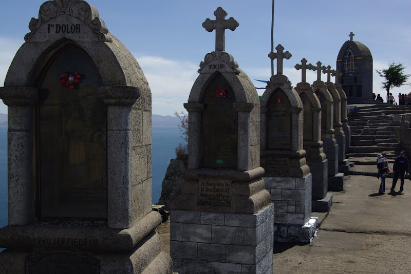 Copacabana okazala sie milszym miasteczkiem niz Puno, pewno dlatego, ze jest mniejsza. Wszedzie mozna dotrzec na piechote, co znacznie ulatwia zycie. Ulatwia, chyba ze chce sie odbyc droge krzyzowa i wejsc na szczyt gorujacego nad miasteczkiem wzniesienia. Droga krzyzowa to nie prznosnia, doslownie mija sie kojelne stacje, aby dotrzec do malego sanktuarium na gorze. Wspinaczke, brak tlenu w piersiach i ogolne zmeczenie rekompensuja piekne widoki na jezioro i Copacabane. Warto bylo.
